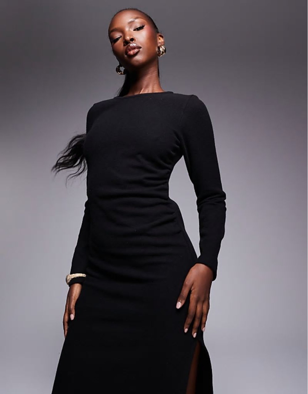 supersoft long sve ruched side maxi dress in black
