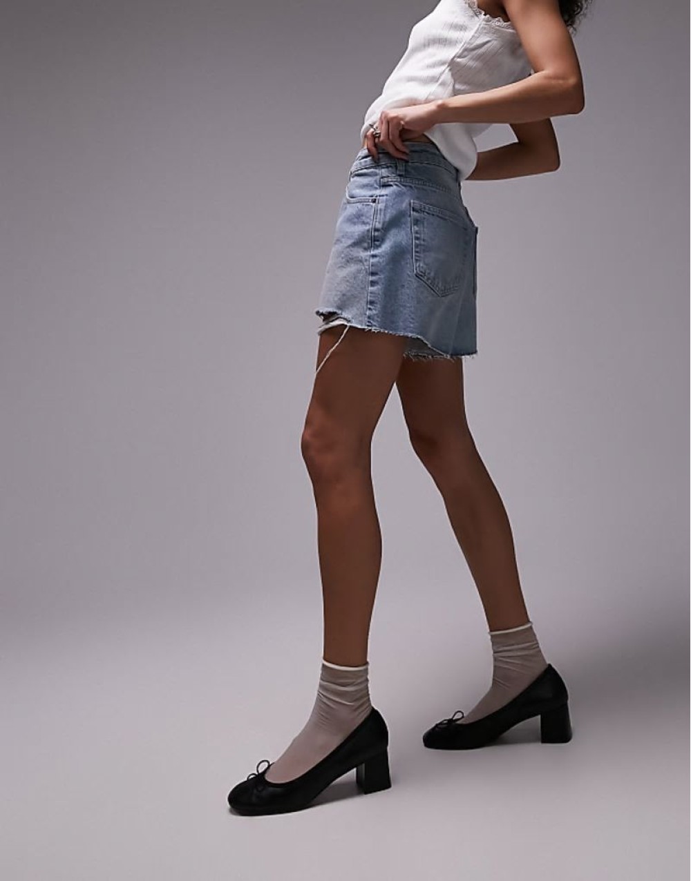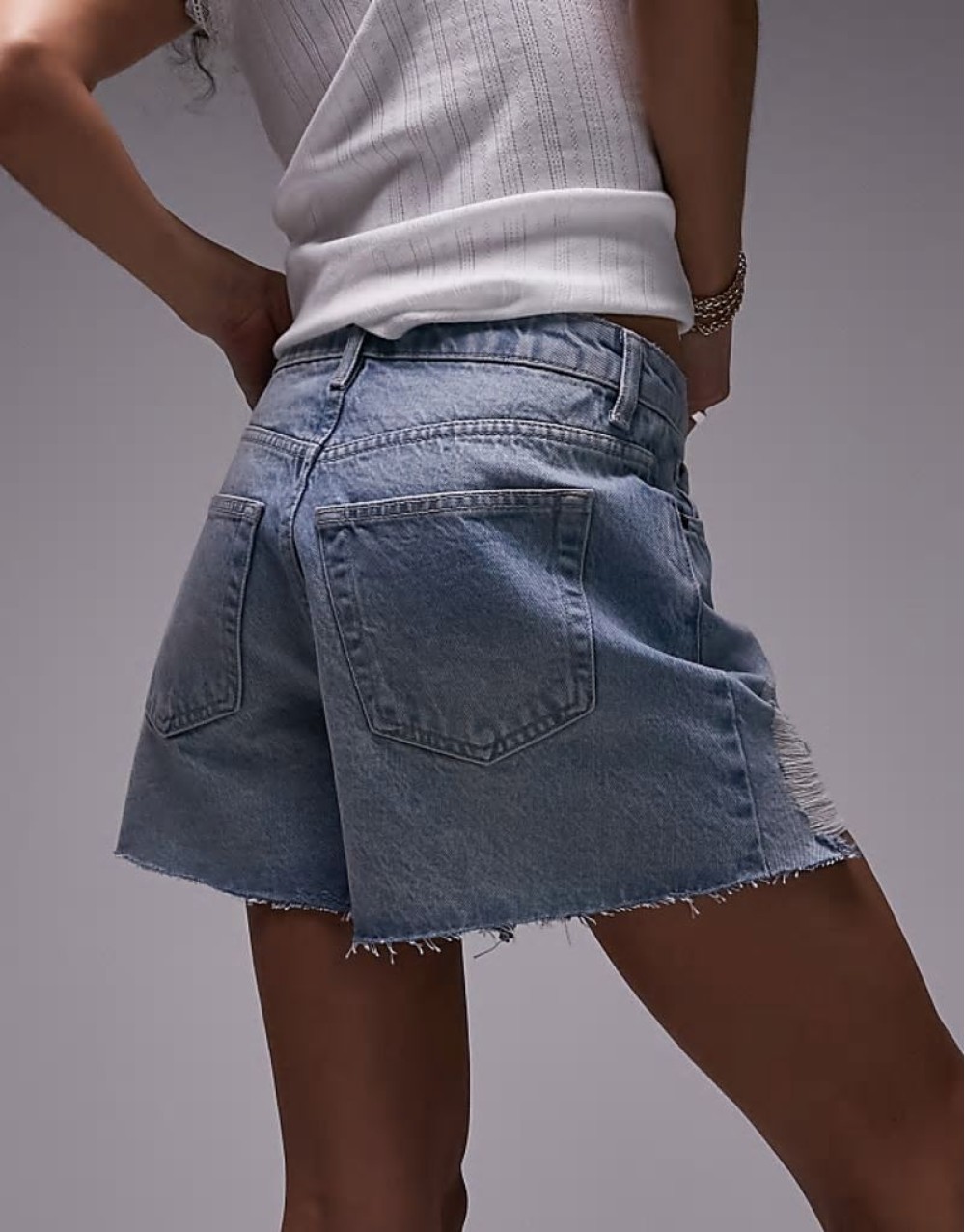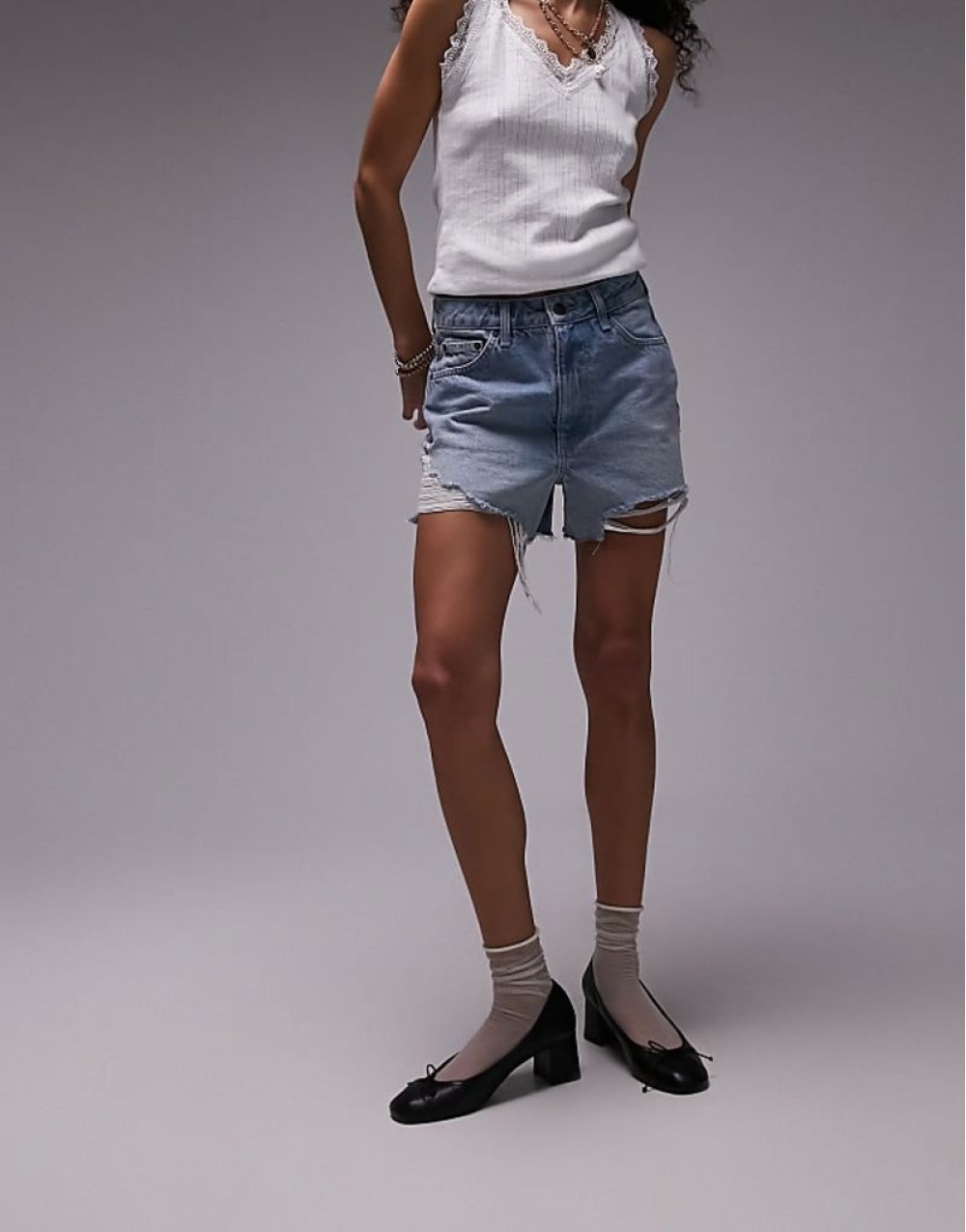 Premium denim a-line Mom Shorts with rip in vintage blue
