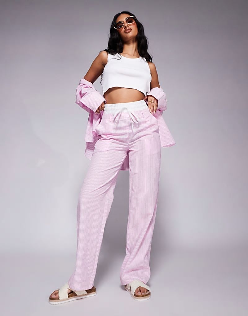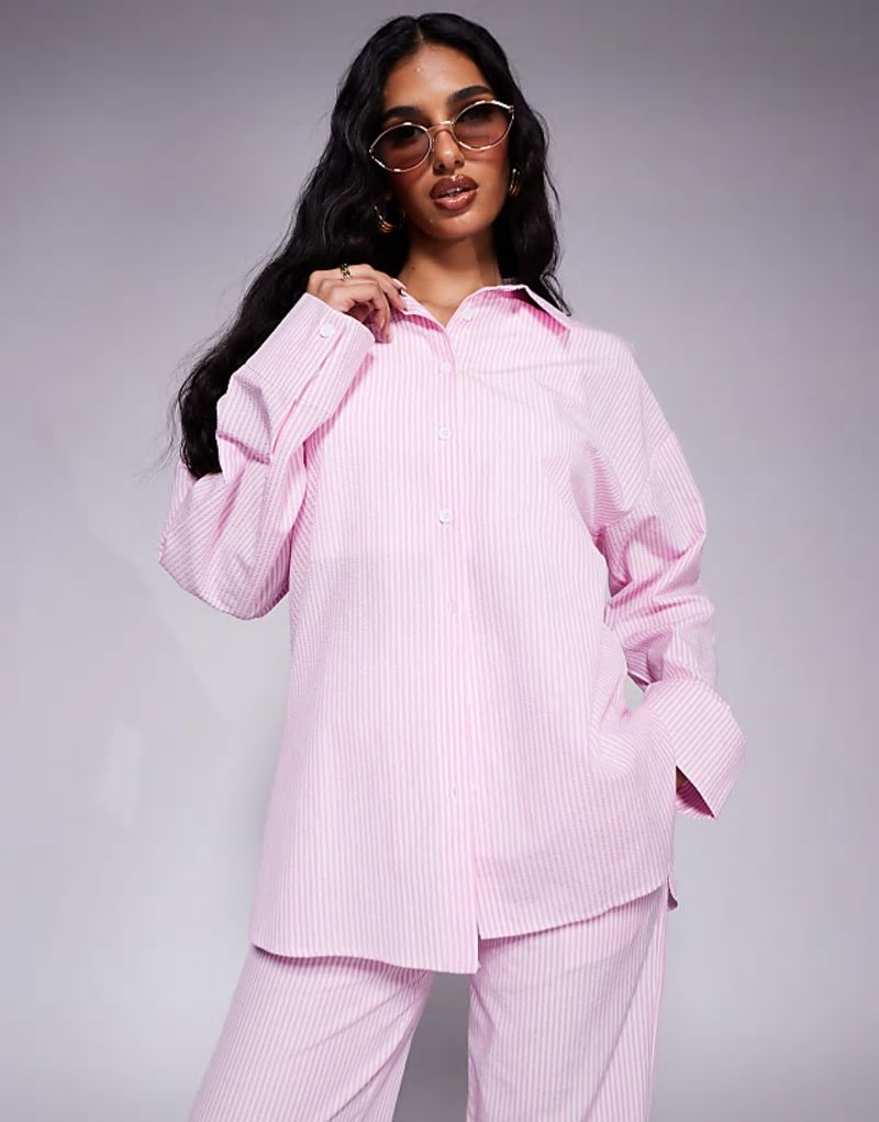 exclusive oversized poplin shirt and trousers co-ord in pink stripe